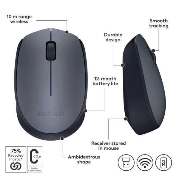 Comfortable and MobileThe shape of the mouse supports your hand for hours of comfortable use. The ambidextrous shape and the ability to reassign right and left button functions make M170/M171 the ideal mice for the right or left hand.